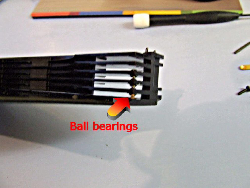 Lift the copper strip, the ball-bearings live in here: